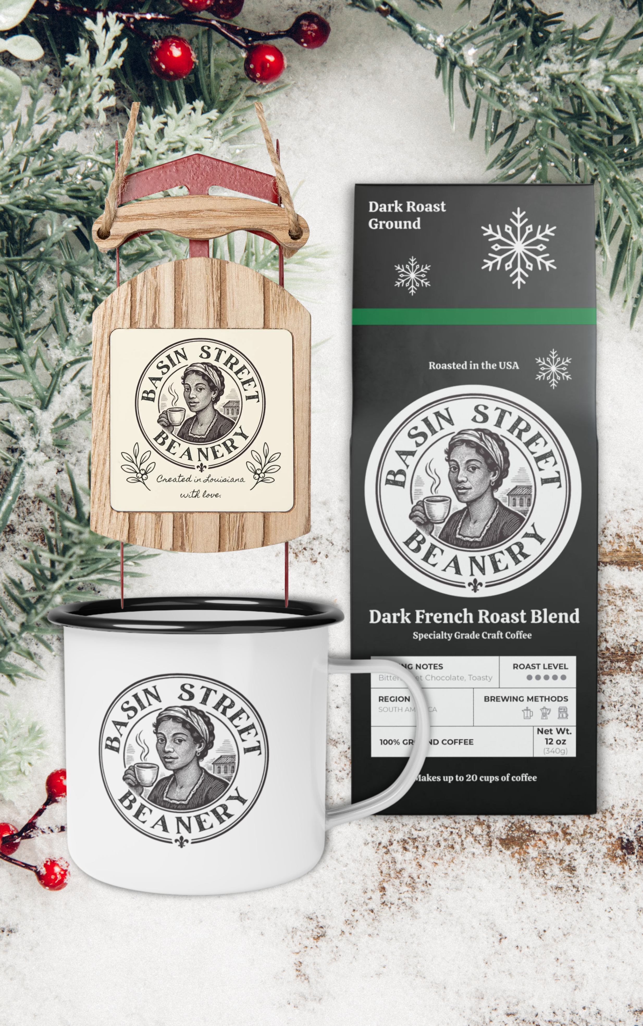 Celebrate the season with the warmth and charm of the Basin Street Beanery Holiday Bundle — the perfect gift for coffee lovers and holiday enthusiasts alike. Inside you’ll find our special Holiday Edition Dark French Roast Blend, a bold and delicious coffee crafted to bring comfort and cheer to every cup. Paired with a Wooden Sled Ornament that adds beautiful touch to your tree, and a classic Enamel Camp Mug for cozy sipping, this bundle captures the spirit of the holidays in one thoughtful package. A cozy, festive gift available in limited quantities — order soon before they sell out!